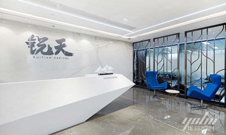 前台材料选用白色人造石,造型酷似一艘扬帆起航的“战舰”,线条充满着张力,给人强烈的视觉冲击力;背景墙配合点光源进行照明点缀,通过光的直射和反射彰显出光韵的美,塑造出高端时尚的办公空间。