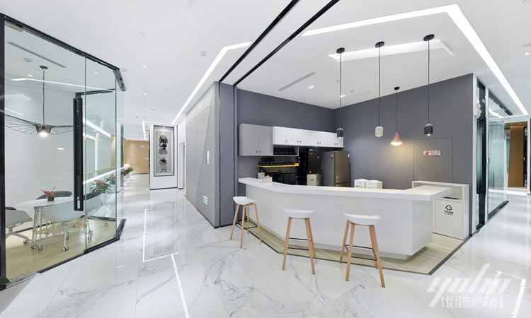 空间设计上传递着现代简约极致的细节美感,流露出科技研发公司的魅力。由于企业运营的特性,需要不同的分区,被划分为前厅、接待洽谈区、共享办公区、会议区、休闲健身区、餐饮茶歇区以及高管办公区七个部分。