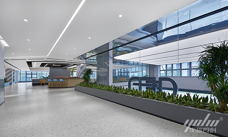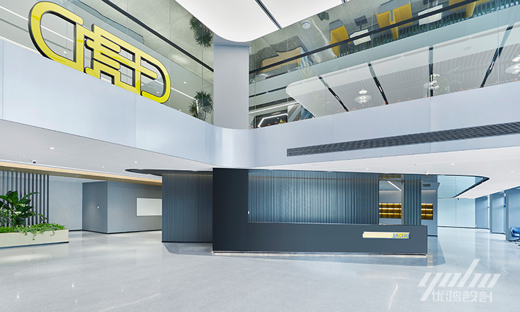 空间通过独特的布局和色彩搭配,展现个性和风格。前厅以冷静克制的大面积深色系为主,配合亮眼的浅灰色水磨石、平整大板面银灰色铝板,带有鲜明的现代工业风格冲击力。大尺度的接待台构成利落的方正体块,在简洁的线条灯光作用下,打造空间纯粹的生命力。